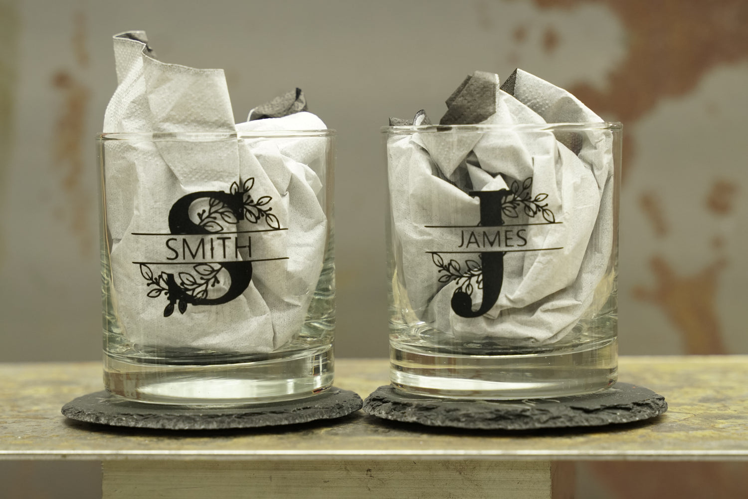 Our goal is to create durable designs that last on whatever you want. Whether that's a pair of whiskey glasses for your backyard barbeque or shirts for your company's team!
